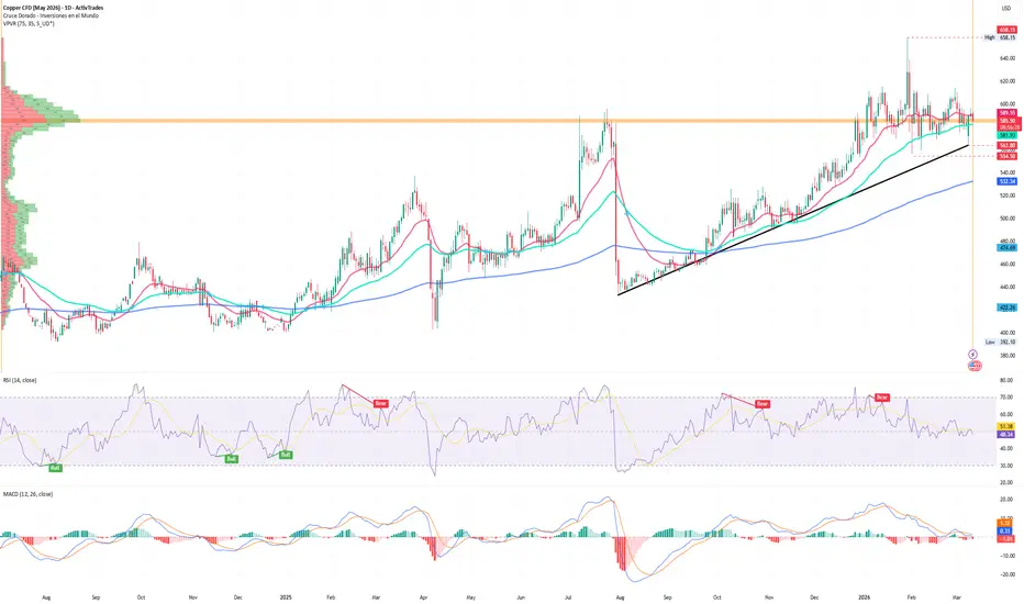 The 50-day moving average was surpassed this European morning, still supporting the price above the 100-day moving average. If the price holds above 581, we could see a new upward impulse toward USD 620; if this level does not hold, the support zones at 563.80 and 554.50 USD will be the next levels to test. Currently, the RSI indicator is in neutral territory, and the MACD has entered negative territory, indicating a lack of upward momentum.