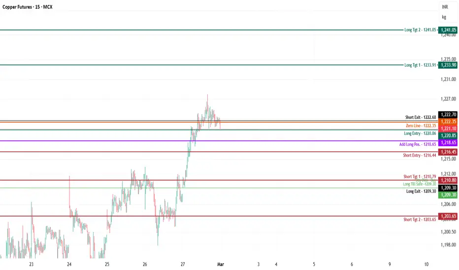 Copper is trading around 1,221.10, holding just below the zero line (1,222.35) after a strong vertical expansion from 1,210 zone. Structure is bullish, but price is currently compressing near resistance. Acceptance above equilibrium is required for continuation.