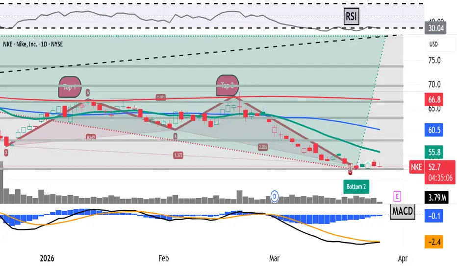 The second double-top pattern occurred just recently, bearing a $60 apparent pivot. Nike appears to have bottomed out (at least for now) coming out of that second double top, falling to a $52.18 intraday low on March 20. That's the stock's lowest trading level since October 2017.