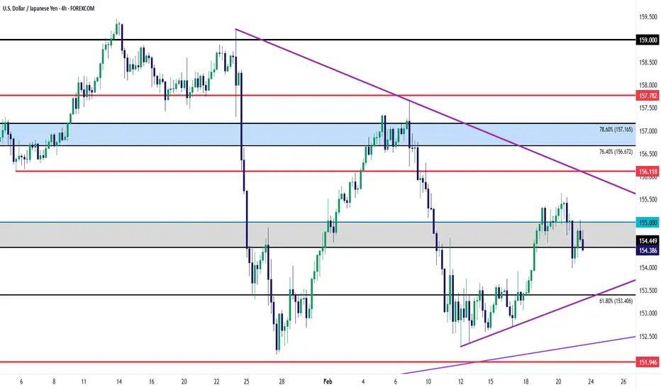 At this point we've seen glimpses of carry unwind like the episode in late-January. And then in February, after the initial bounce from that sell-off, we saw a couple of curious drivers as the pair sold-off after a Sanae Takaichi win - a factor that many widely assumed to be a bullish USD/JPY (and bearish JPY) driver - and then a strong NFP report in the US merely drove a bounce up to a lower high with sellers ultimately returning to hold 154.45.