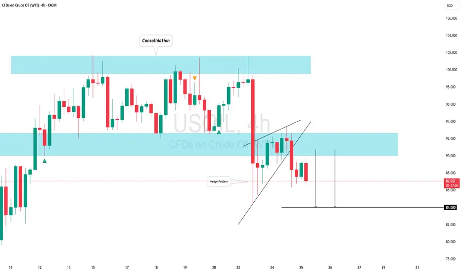 USOIL broke and closed below a significant horizontal support of a trading range on a 4-hour timeframe.