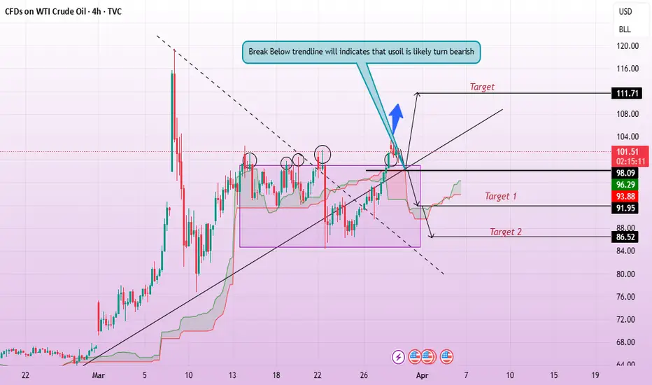 The chart illustrates WTI crude oil trading in a consolidation phase following a strong bullish rally 📊. Price has repeatedly tested the resistance zone around 101, forming multiple rejection wicks that highlight strong selling pressure at this level. Despite this, the ascending trendline continues to act as dynamic support, maintaining the overall bullish structure. Currently, price is approaching a key breakout zone, making the next move crucial 👀. A successful breakout above resistance could trigger strong bullish momentum, pushing price toward the target of 111.71 🚀. However, if price breaks below the trendline, it would signal weakness, leading to a decline toward the first bearish target at 91.95, with further downside potential extending to 86.52 if selling pressure intensifies.