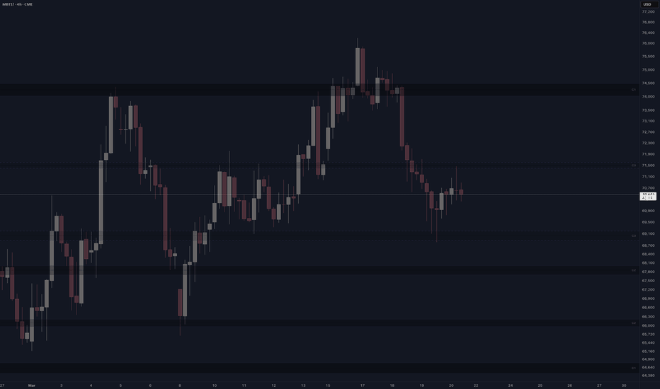 Bitcoin's Make-or-Break Level: 70K Holds the KeyBitcoin CME Futures are testing a critical confluence zone. Price at 70,960 is hovering right at the 50% Fibonacci retracement (71,695) — the midpoint of the entire 2022–2025 rally from 15,680 to 127,710.