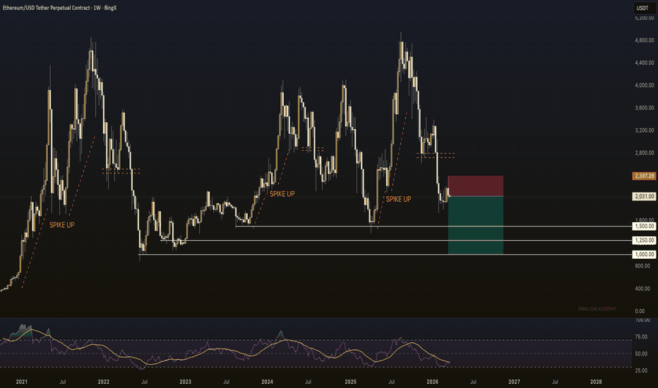 Ethereum | Can See It But Can't Prove It....Falling and FallingLooking just at that weekly timeframe, we are seeing that same pattern forming. Now what we noticed is that after the double spike we've been having on the markets and some time price trading near the new local highs, we eventually have that big "market structure break."