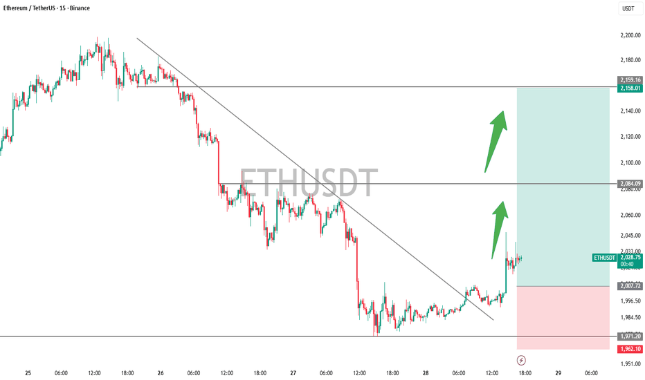 ETHUSDT Trendline Break + Reversal Structure ETHUSDT on the 15M timeframe is showing a clean **trend reversal setup** after breaking out of a strong descending trendline.