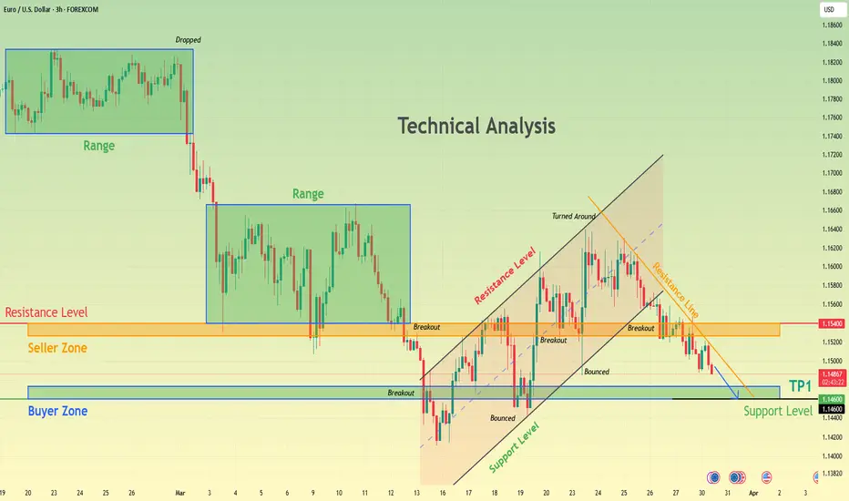 Hello traders! Here’s my technical outlook based on the current EURUSD (3H) chart structure. Price initially moved inside a range before breaking down sharply, confirming strong bearish momentum. After the drop, EURUSD formed another consolidation range, which later broke to the downside, reinforcing the bearish trend. Currently, price is trading below the 1.1540 resistance (seller zone) and approaching the 1.1460 support (buyer zone). The market is also forming a lower high within a descending structure after rejecting the recent resistance trend line. As long as price remains below the 1.1540 resistance, the bearish bias stays valid. A continuation lower could push EURUSD toward the 1.1460 support (TP1), which is the main downside target. Please share this idea with your friends and click Boost 🚀