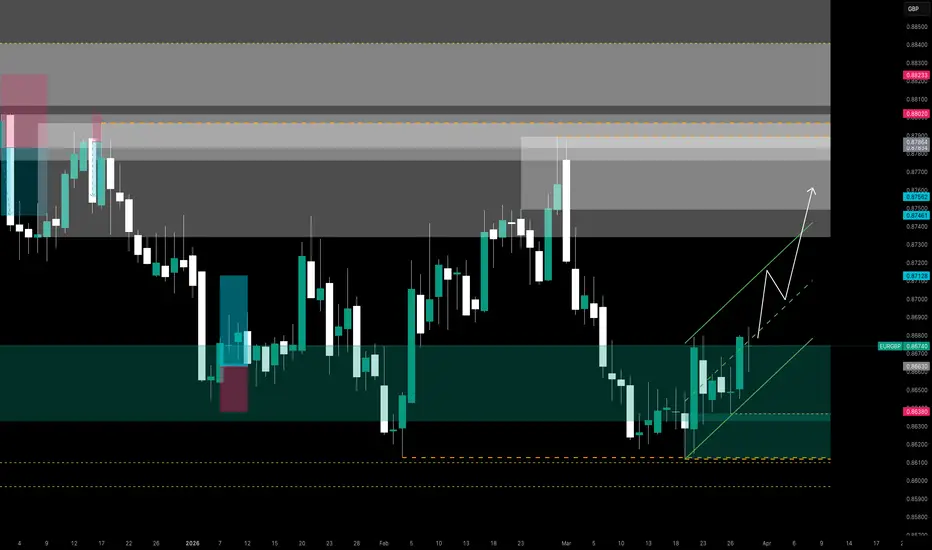 On EUR/GBP, my short-term view is constructive, but still balanced on the broader daily structure. Price has reacted cleanly from the 0.8610–0.8640 demand and is now pushing higher, forming higher lows. As long as this area holds, I see room toward 0.8745/0.8760. However, I do not consider this a full trend reversal yet, as a strong supply zone sits above at 0.8780–0.8800, extending toward 0.8823, where sellers could re-enter.
