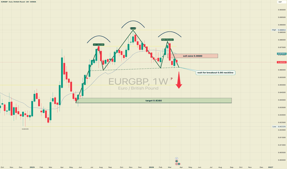 EURGBP 1W: the market just drew the textbookEURGBP is currently one of those rare charts where the market is doing exactly what classical technical analysis says it should do. On the weekly timeframe, a clean head and shoulders structure is already in place and this is not a case for interpretation, it is a case for execution.