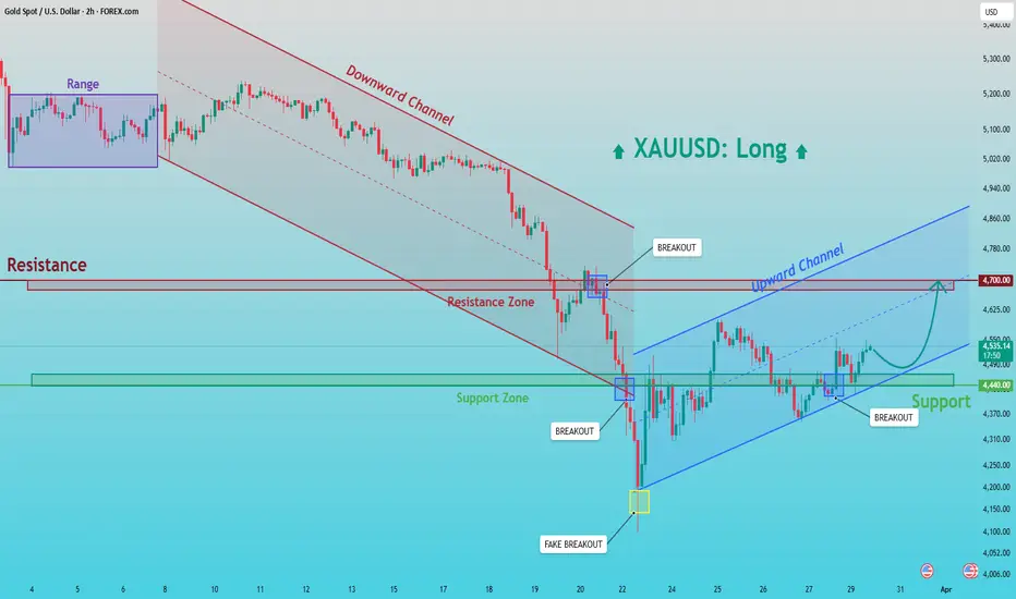 As long as XAUUSD holds above the 4,440 support and respects the ascending channel, the bullish bias remains valid. A continuation higher could push price toward the 4,700 resistance, which is the main upside target.
