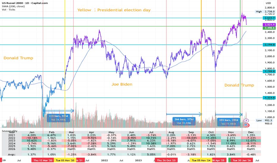 RUSSEL2000 DOWNSIDE?An analysis of historical price movements suggests that the Russell 2000 Index tends to enter an upward trend starting about one year before a U.S. presidential election. The 200-day moving average currently stands at around 2,417. This indicates that the index is highly sensitive to political regim