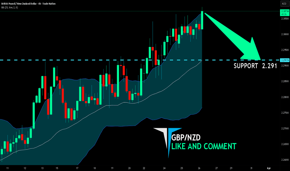 GBP/NZD pair is trading in a local uptrend which we know by looking at the previous 1W candle which is green. On the 4H timeframe the pair is going up too. The pair is overbought because the price is close to the upper band of the BB indicator. So we are looking to sell the pair
