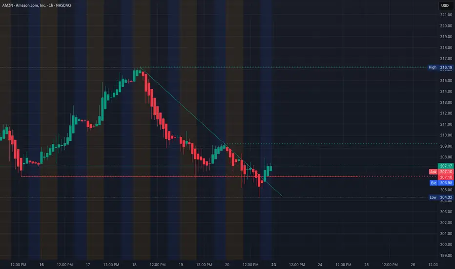 Looking at AMZN right now, price is coming off a selloff but starting to stabilize around the 205–207 area.