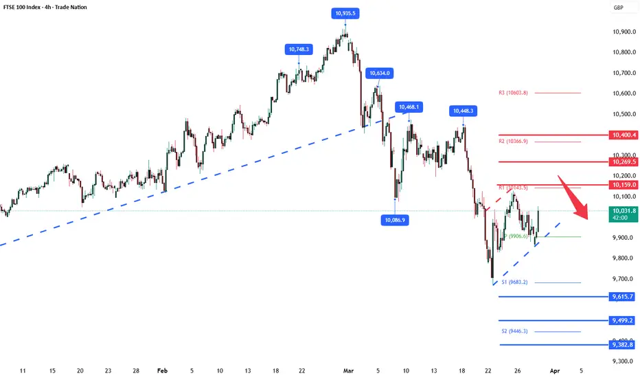 FTSE remains under bearish pressure, with the 10,160 level acting as a key inflection point. As long as the price remains below this level, the bias favours further downside. Traders should watch for price confirmation around that level to assess the next move.