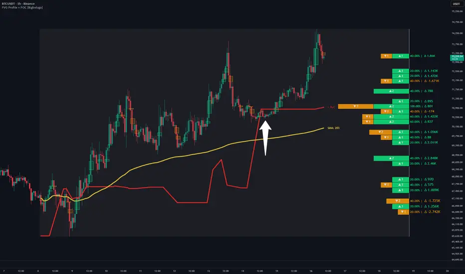 By combining FVG count, directional balance, delta volume, and strength normalization, it provides a powerful way to analyze imbalance behavior beyond traditional volume profiles.