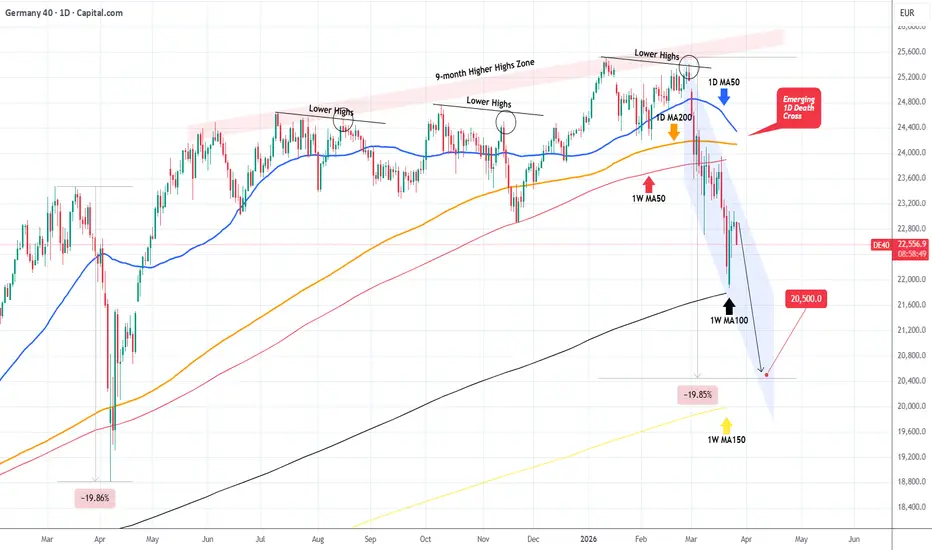 With the German economy being more affected by the energy crisis of the Iran - U.S. war than the other indices, this situation can easily get worse, given also that technically the index failed to reclaim and got rejected on its 1W MA50 (red trend-line) in the past 2 weeks.
