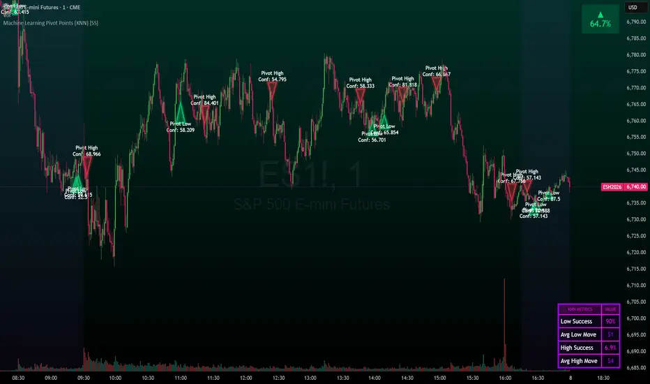 Machine Learning Pivot Points (KNN) is a predictive structural tool that moves away from traditional lag based oscillators. Instead of waiting for a moving average crossover, this system treats price action as a Geometric Slope. By utilizing a K-Nearest Neighbors (KNN) algorithm combined with regression, the script captures the mathematical "DNA" of the price leading into a pivot and compares it against a live updating database of previous market turns.