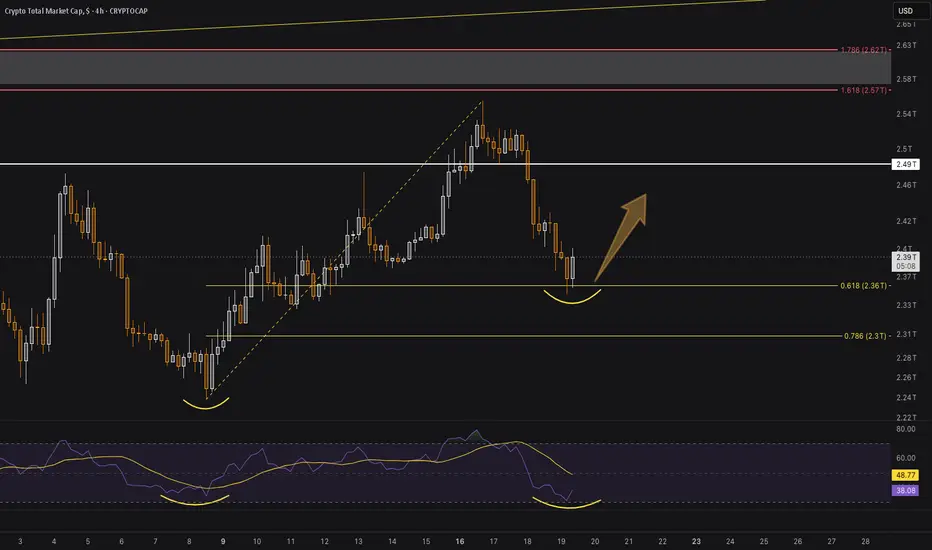 A bullish engulf candle on the 4HR chart from the 0.618 Support with only minutes until close. RSI hidden bullish divergence is printing. TOTAL may make an attempt for the upper 1.618 Resistance level.
