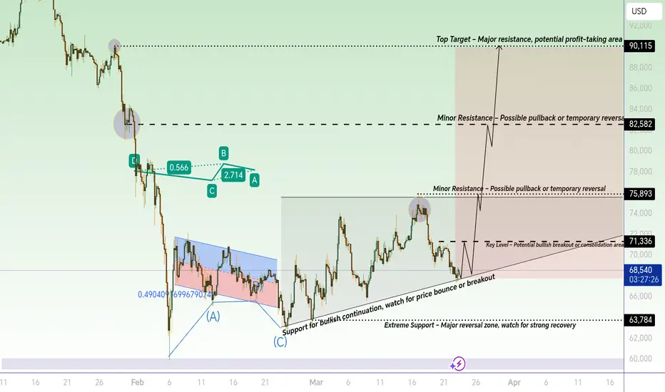 BTC is forming strong support around 68,461 with an ascending trend line indicating potential bullish continuation. Watch for key breakout above 71,336 for upside momentum targeting 75,893, 82,582, and the top target at 90,115. Minor resistance zones may cause temporary pullbacks; monitor price action for confirmation and profit-taking opportunities. Extreme support at 63,784 could offer strong reversal potential if tested.