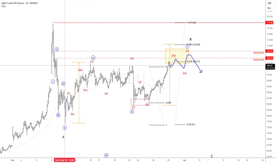 Crude oil has rallied sharply from the March 10th low near 75, unfolding in what appears to be at least a three-wave recovery, as outlined in our previous analysis. With the latest price action, the market has now pushed back above the 100 level and is testing the prior wave “a” high, signaling entry into a critical resistance and potential reversal zone.