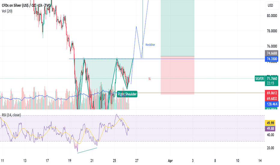 Possible Silver Long TradeA prominent inverse head and shoulder pattern is forming on one hour timeframe which can result in reversal from current downtrend. Another bullish indication is bullish divergence forming on left shoulder and head. Only enter trade if neckline is broken so a buy stop order can be placed.