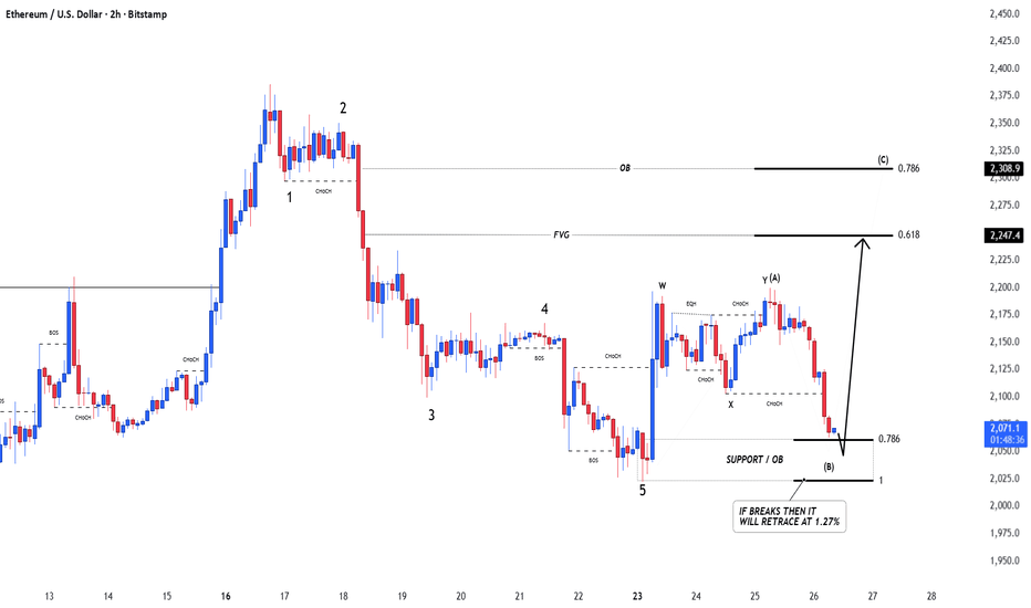 ETHUSD Short-Term Reversal SetupEthereum is showing a clear bearish market structure after breaking multiple support levels (BOS) and forming a descending channel. Price has recently dropped sharply into a strong demand zone around the 1,950–2,000 area, where a short-term consolidation is forming. This suggests a possible relief b