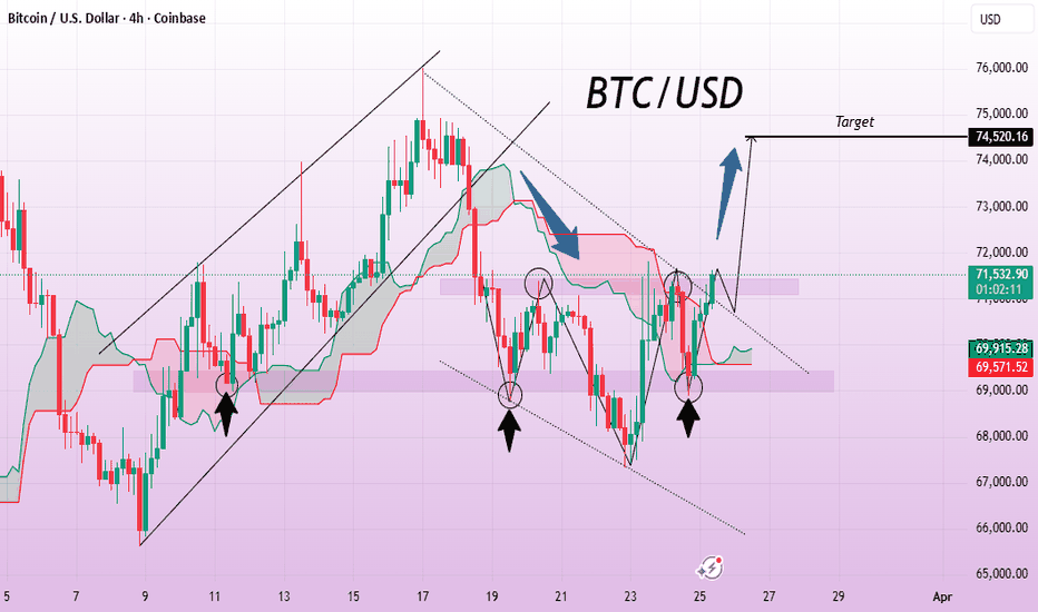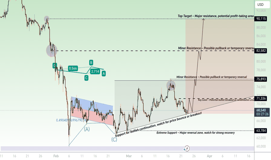 BTC / USD – Key Levels & Potential Bullish SetupBTC is forming strong support around 68,461 with an ascending trend line indicating potential bullish continuation. Watch for key breakout above 71,336 for upside momentum targeting 75,893, 82,582, and the top target at 90,115. Minor resistance zones may cause temporary pullbacks; monitor price acti