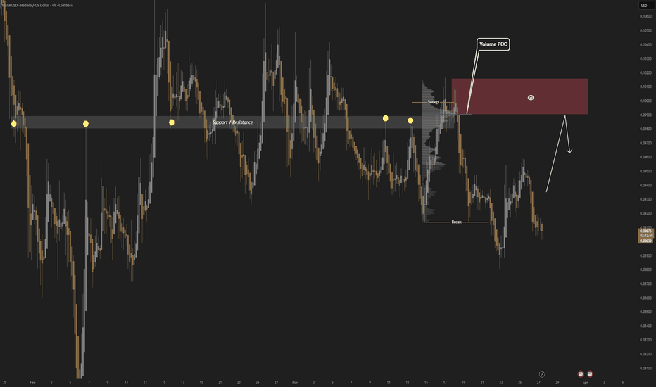 HBATUSDT, ANALYSIS Hedera price hold the resistance around $0.10 after a filled supply the price has has entered a range market side way movement and already broken down side and ready to take out the liquidity on the lower side, So what’s next? If the HBAR price breaks down, below the demand level the structure coul