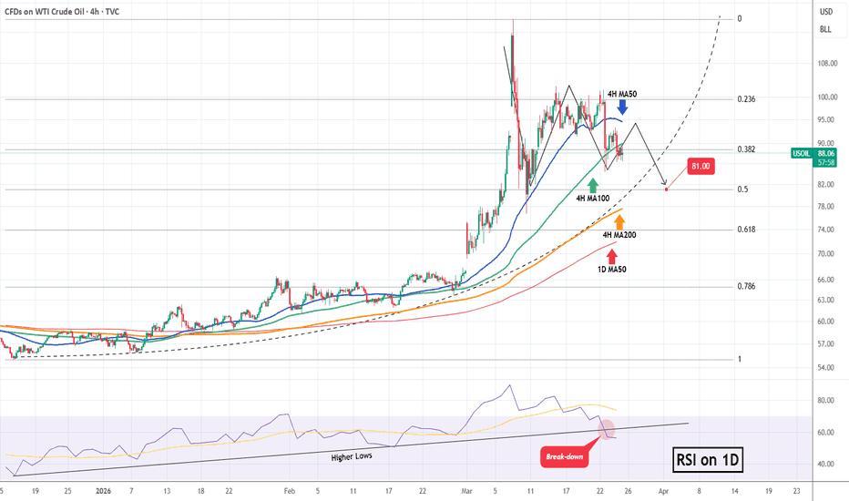 Technically, this is bearish continuation signal towards the next Support, which is the 4H MA200 (orange trend-line). We expect contact to be made with it at $81.00, which is exactly on the 0.5 Fibonacci retracement level from the recent Top. An additional short-term Sell Signal is the 1D RSI breaking below its 3-month Higher Lows trend-line.