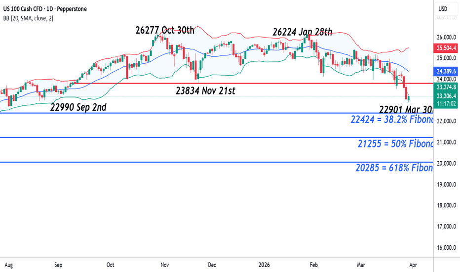 Iran conflict and Key US Data Collide to Influence sentimentIt’s the start of a critical week for US 100 traders. The index entered correction territory on Friday, officially defined as a move of 10% below its previous high, and it briefly extended that fall in early trading this morning when it touched a low of 22901 before recovering to trade around 23162 at time of writing (0700 BST). Part of the reason for the early drop to 8-month lows could have been news of the arrival of 3500 US troops in the Middle East region on Saturday, via an amphibious assault ship (Bloomberg), which has forced traders to consider the possibility of a US led ground assault of Iran, or it could have been news that Iranian backed Houthi rebels in Yemen have officially entered the conflict after firing ballistic missiles at Israel over the weekend, opening up a new risk to oil shipments from the region.