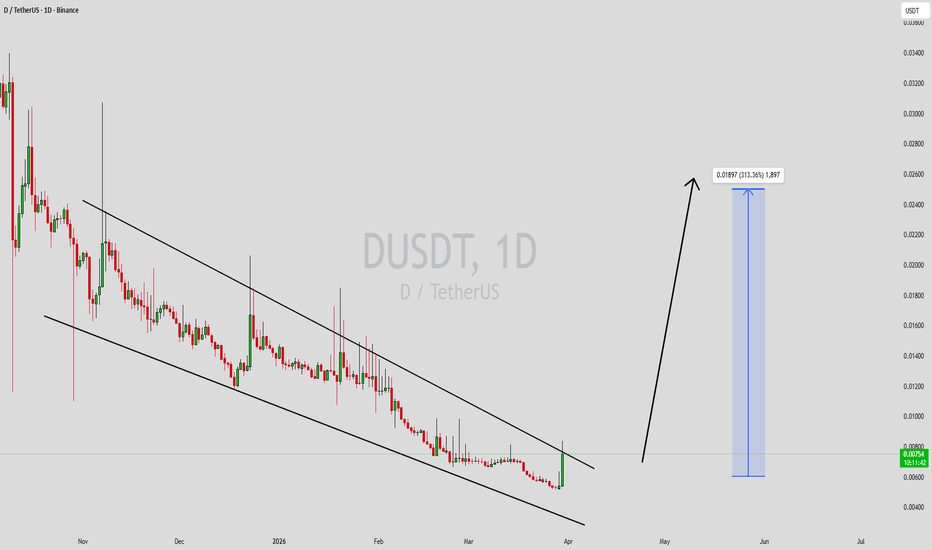 DUSDT Forming Falling WedgeDUSDT is forming a clear falling wedge pattern, a classic bullish reversal signal that often indicates an upcoming breakout. The price has been consolidating within a narrowing range, suggesting that selling pressure is weakening while buyers are beginning to regain control. With consistent volume confirming accumulation at lower levels, the setup hints at a potential bullish breakout soon. The projected move could lead to an impressive gain of around 290% to 300% once the price breaks above the wedge resistance.