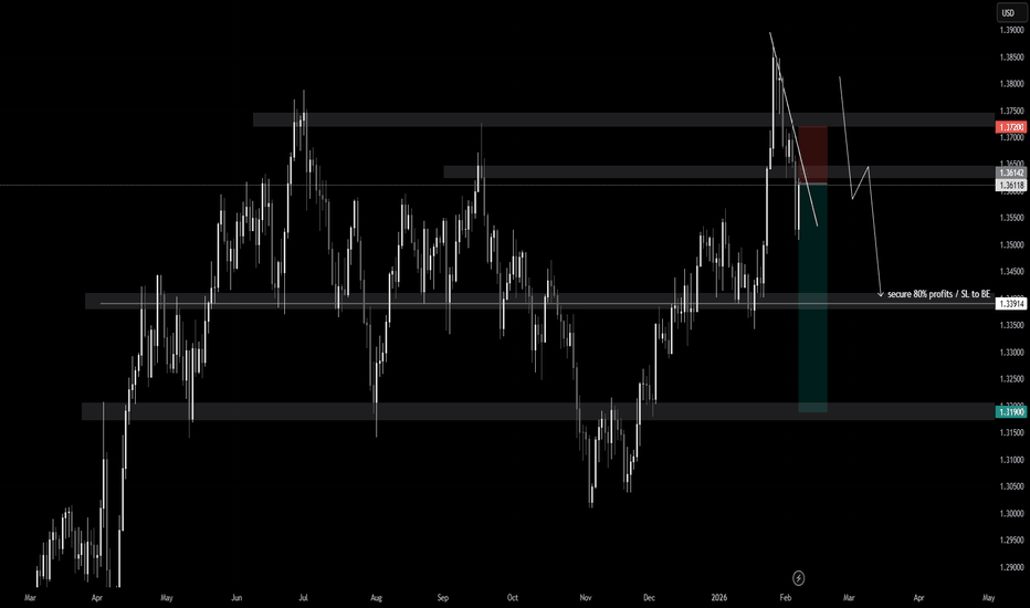 EURUSD previously traded inside a descending channel, forming lower highs and confirming sustained bearish pressure. After a breakout from this structure, price made a strong upward move but quickly lost momentum and entered a range. Following the range, price resumed its decline, forming a broader bearish structure under a descending trend line.