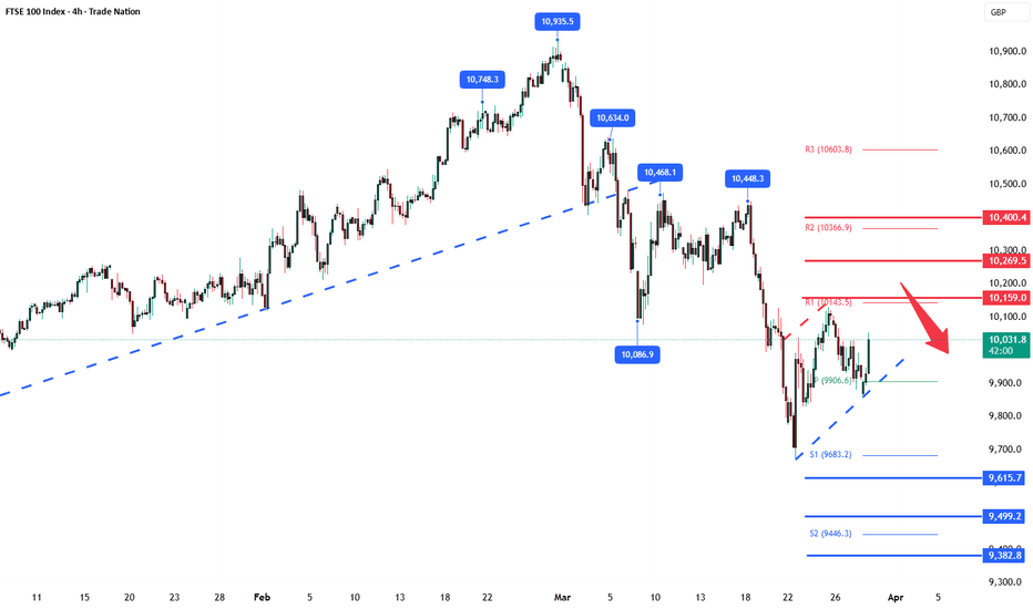 FTSE oversold bounce back capped at 10160The FTSE continues to display a bearish outlook, in line with the prevailing downward trend. Recent price action suggests a loss of support, potentially setting up for another move lower if resistance holds.