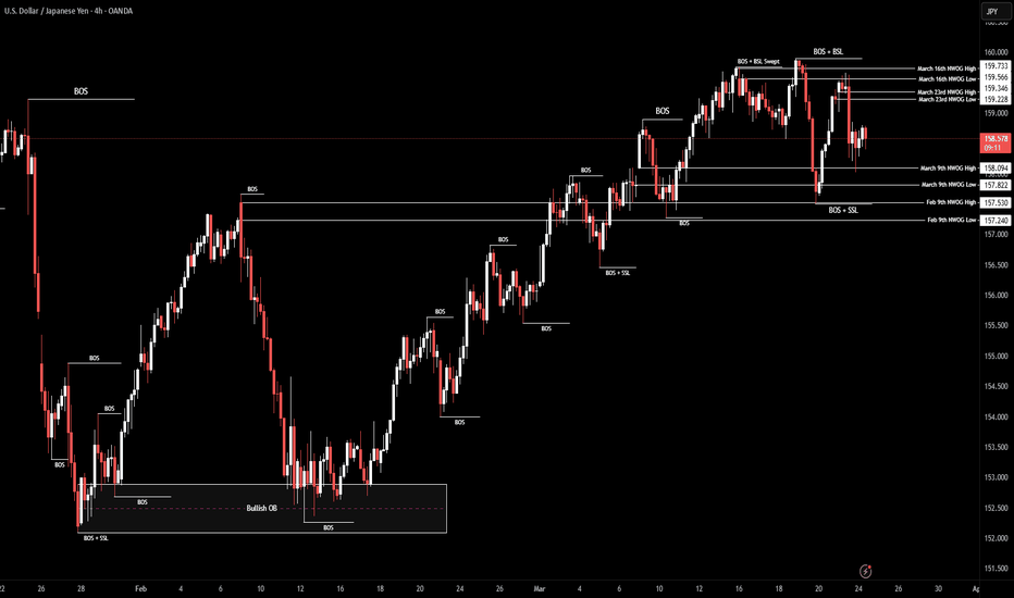 USD/JPY | End of bullish run? (READ THE CAPTION)After dropping from 159.90 all the way to 157.51, USDJPY bounced back up but failed to go through the March 16th NWOG and after reaching the C.E., it dropped back again, reaching the March 9th NWOG High and then went back up, currently being traded at 158.50.