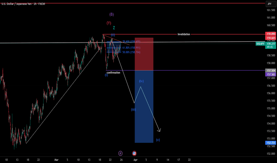USDJPY – Potential Wave C Downside SetupOn the higher timeframe (Daily), a full 5-wave impulsive structure appears to be completed. This shifts the focus towards a larger ABC correction, where Wave A and B are likely already in place.