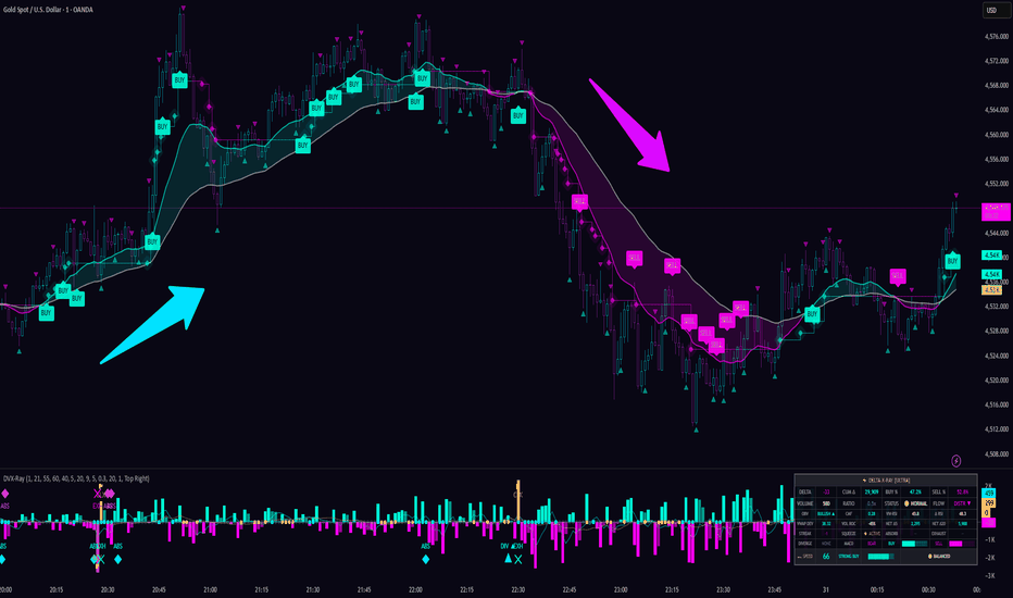 Trend + Delta Context โ In addition to trend direction, the indicator aggregates directional volume (delta) to reveal participation strength.