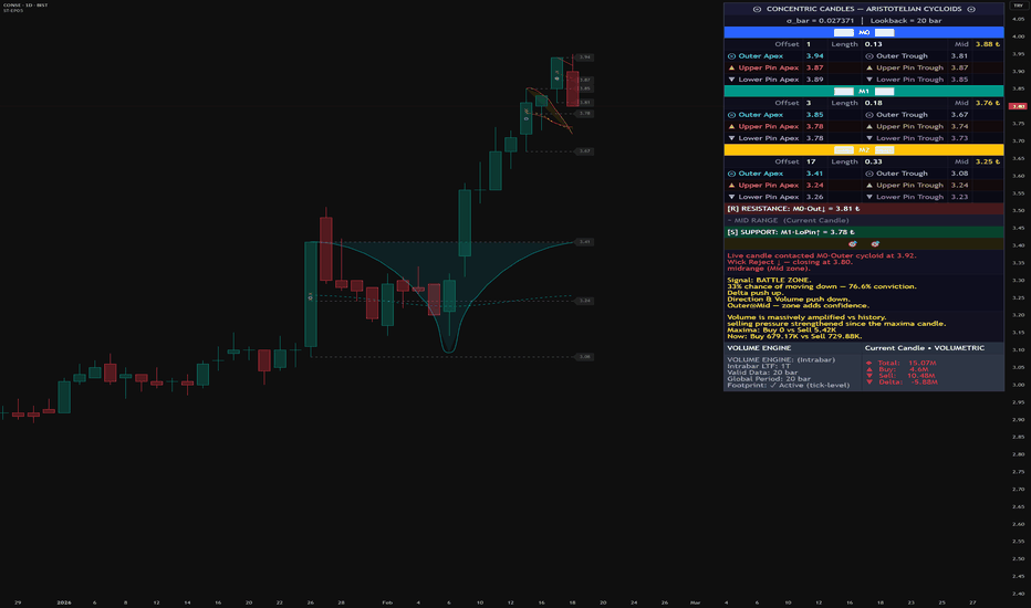 Forecast Beam : Extends forward from the most recently confirmed pivot, projecting the statistically expected next leg. Cone width encodes uncertainty drawn from sample variance.