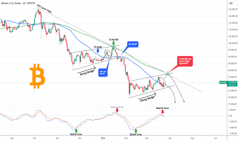 BITCOIN Last rally or straight lower?Bitcoin (BTCUSD) is currently around its 1D MA50 (blue trend-line), trading within a Rising Wedge pattern since the February 06 Low. This resembles the pattern of December - January that eventually broke downwards after a test-rejection on its 1D MA100 (green trend-line) and the Lower Highs trend-li