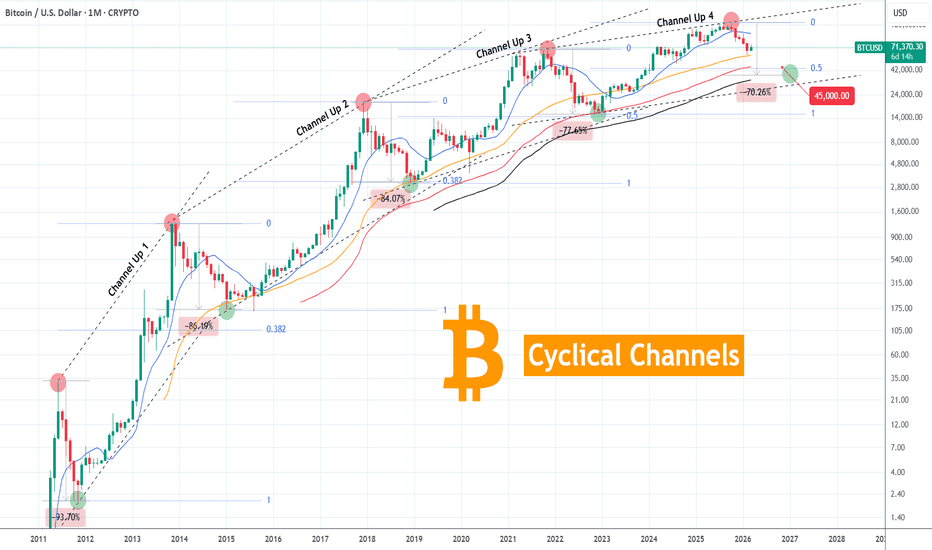 BITCOIN This secret sequence of Channels unlocks the Cycle codeBitcoin (BTCUSD) is technically half-way through its Bear Cycle by all known metrics, both in terms of price and time. What we haven't shown you yet (actually we have published this thesis 6-7 years ago and it's since been forgotten) is the underlying Channel Up approach on a Cycle horizon that has